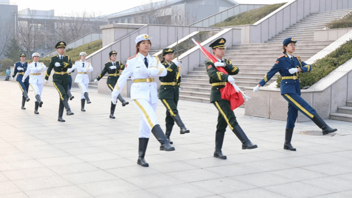 晨光初照,国旗飘扬。伴随着铿锵有力的步伐,国旗护卫队庄严护送五星红旗至升旗台前。雄壮的《义勇军进行曲》奏响,五星红旗迎着朝阳冉冉升起、迎风招展,全体师生肃立注目,神情庄重。