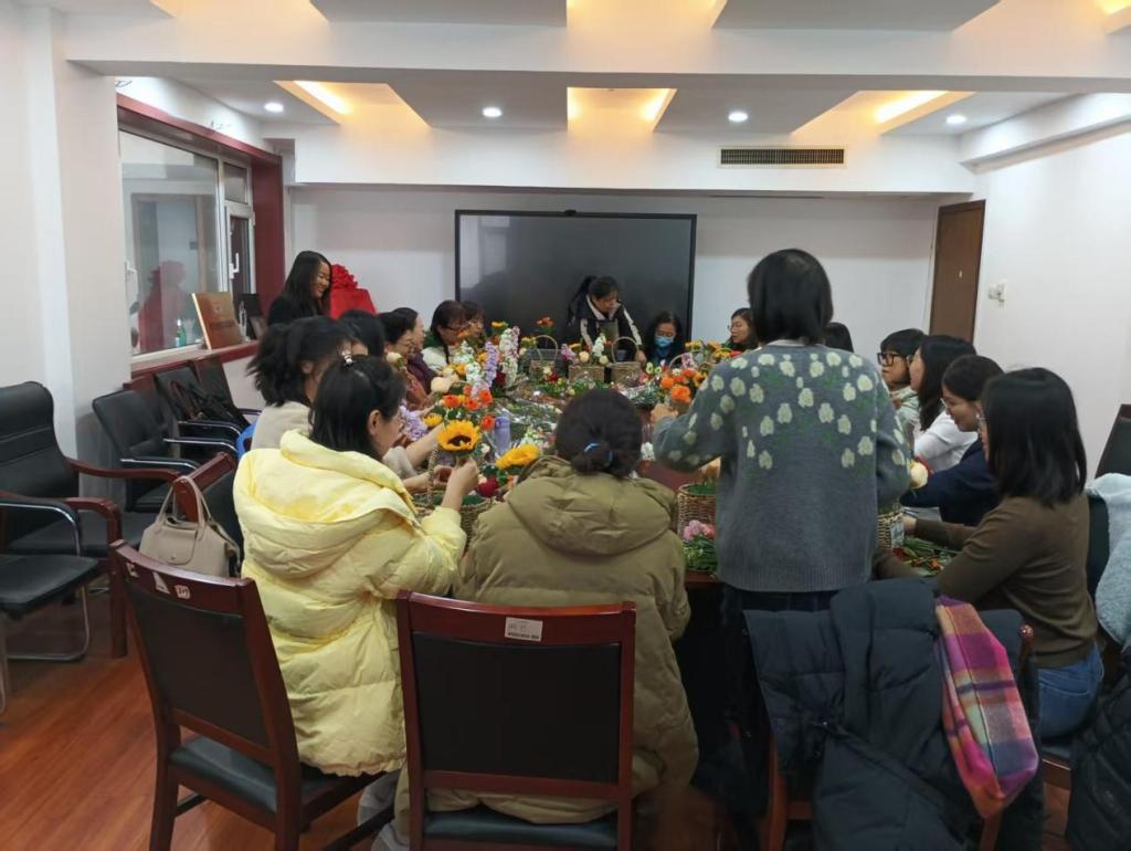 老师们跟随园艺师的指导开展插花活动,在老师们精心细致地编织下,一座座精美的花篮被创造出来,现场洋溢着欢快的气氛。